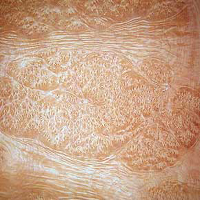 Madrone Burl is absolutely gorgeous.  It is pastel red in color with tight clusters of burl patterns wrapped in wavy lines.  Pictured is a tight cluster.  Due to its' color, it is best left unstained.  Staining to other colors can be done but options are limited.
