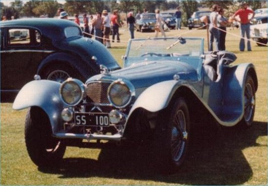 The SS100 is a British 2 seat sports car built between 1936 and 1940 by SS Cars Ltd of Coventry, England. The last one is thought to have been delivered in 1941. In 1936 the name Jaguar was given to a new saloon car and from then on to all the cars. Following World War II, due to the connotations then attached to the initials SS, the company was renamed Jaguar. The chassis with a wheelbase of 8 feet 8 inches (2.64 m) was essentially a shortened version of the one designed for the 2.5 litre saloon, a car produced in much greater numbers, and had first been seen in the SS 90 of 1935. Suspension was on half elliptical springs all round with rigid axles. The engine was a development of the old 2.5 litre Standard unit converted from side valve to overhead valve with a new cylinder head designed by William Heynes and Harry Weslake. The power output was increased from 70 bhp (52 kW) to 100 bhp (70 kW). Twin SU carburettors were bolted directly to the cylinder head. In 1938 the engine was further enlarged to 3.5 litres and the power increased to 125 bhp (93 kW). The four speed gearbox had synchromesh on the top 3 ratios. Brakes were by Girling. The complete car weighed just over 23 cwt (2600 pounds, 1150 kg). On test by The Autocar in 1937 the 2.5 litre (20 RAC hp rating) car was found, with the windscreen lowered, to have a maximum speed of 95 mph (153 km/h) and a 0 to 60 mph (97 km/h) time of 13.5 seconds. With the 3.5 litre (25 RAC hp rating) the top speed reached the magic 100 mph (160 km/h) with a best of 101 mph (163 km/h) over the quarter mile and the 0 - 60 mph (97 km/h) coming down to 10.4 seconds. In 1937 the 2.5 litre car cost GBP395 and in 1938 the 3.5 litre GBP445.[2] The coupé, of which only one was made, was listed at GBP595. A few examples were supplied as chassis only to external coachbuilders. Widely considered to be one of the most aesthetically pleasing Jaguar cars it is also one of the rarest with only 198 of the 2.5 litre and 116 of the 3.5 litre models being made. Most stayed on the home market but 49 were exported. Cars in good condition will fetch well in excess of GBP100,000, a near concours example was sold by auctioneers Bonhams at the Goodwood Festival of Speed in 2007 for GBP199,500. |