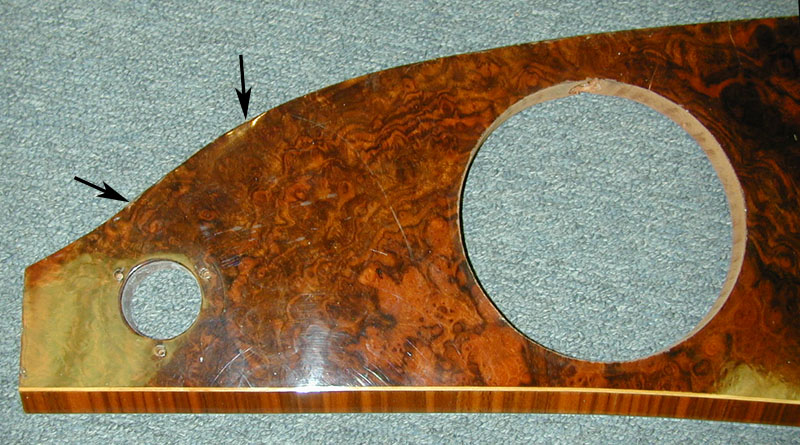 BUT upon closer examination, you can see why our customer sent their woodwork to us. In the picture above, you can see cracks in the clear finish. They appear as white lines - at the centerline and in the crossbanding. |