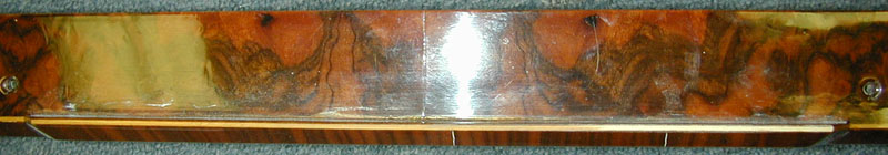 Now scroll back up to the top two pictures. Look closely at the top edges and you will see slight waves in the edge line, some hairline cracks and those yellowish reflections are where the veneer and clear finish is lifting bulging upward. This is an indication something is really wrong. |