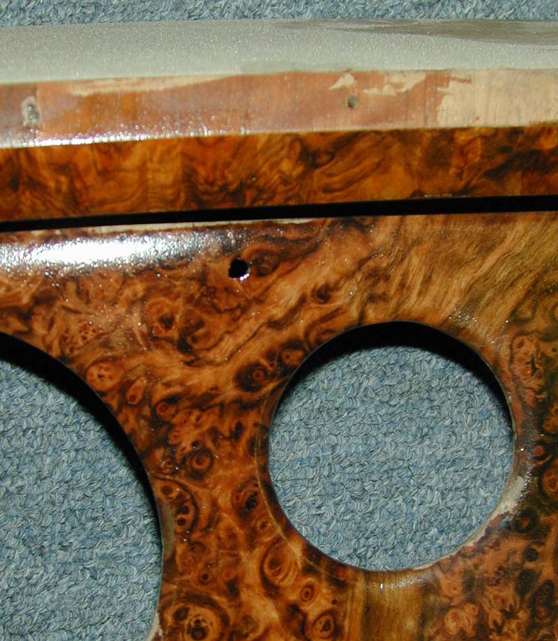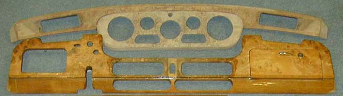In the picture below, we wetted the Upper Dash Panel and the Instrument Panel which have been sanded and are now bare wood. You can see how the color and wood grain pattern "comes alive" on those parts. The darker lines, knots and "eyes" had nearly faded away, and now you can see a beautiful "contrast".