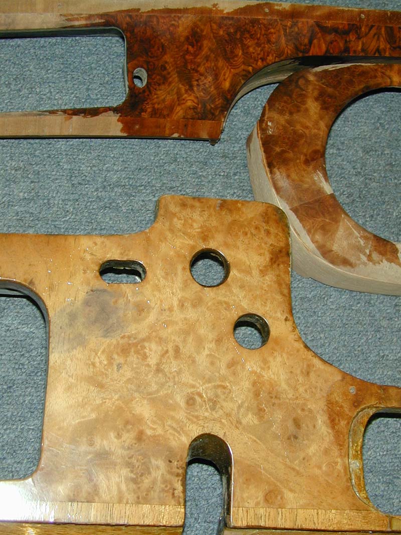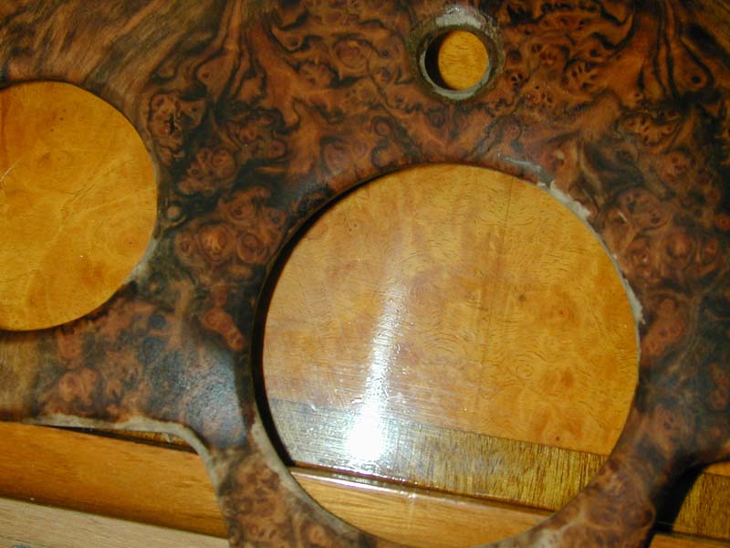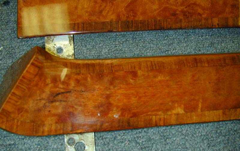 Below you can see that when we remove the clear finish and sand the wood, we sand away a micorscopic layer of wood cells that have changed in color. The woodwork on this Silver Cloud was Burled Walnut and it was originally medium-brown with a hint of red in it.. |
